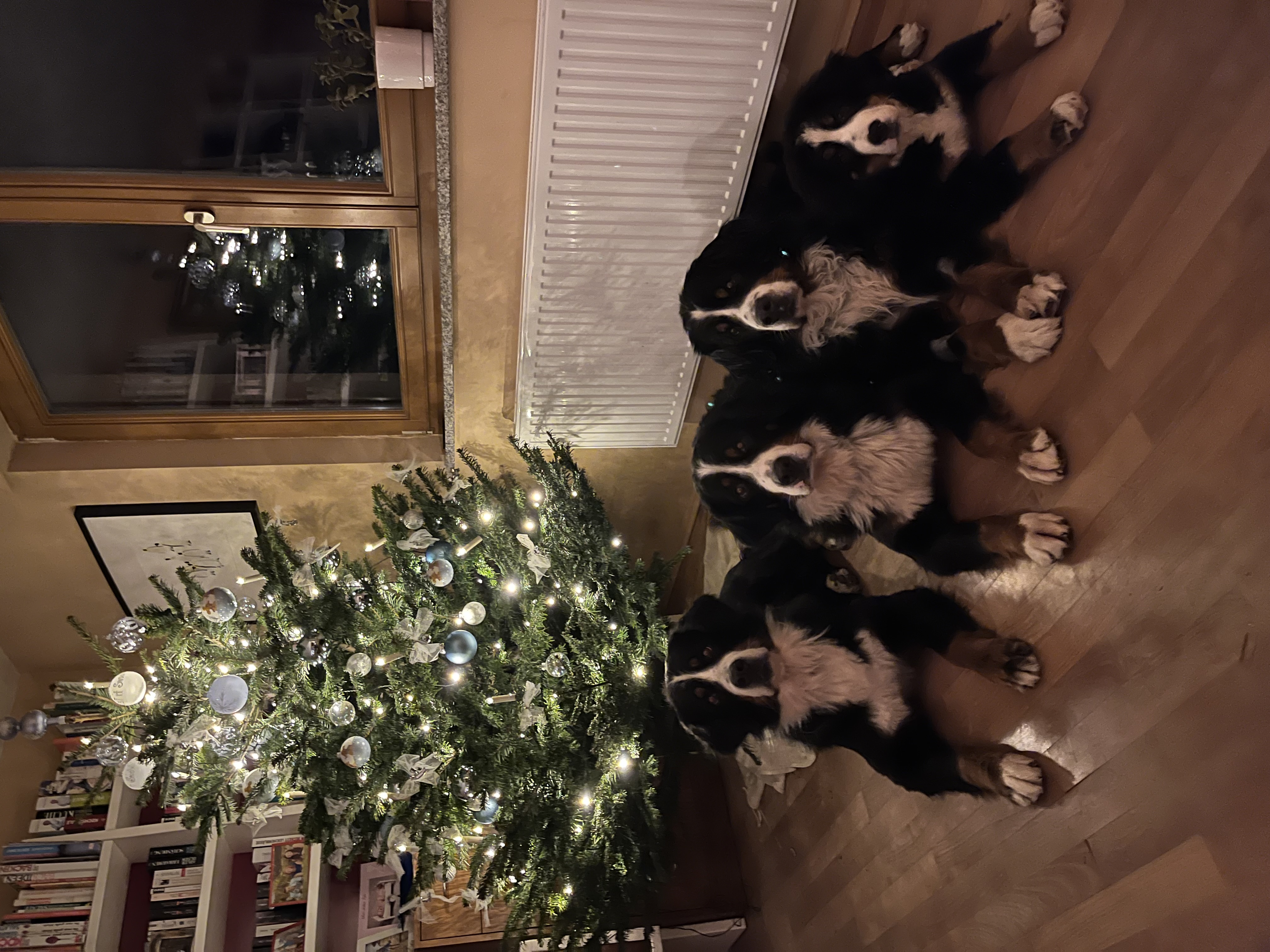 Vier Hunde sitzen unter unserem Christbaum.